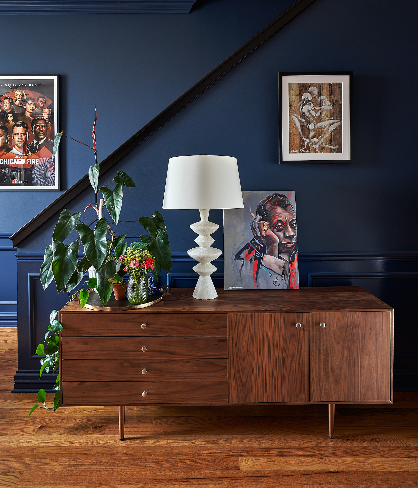 For one of our recent clients, a writer, performer and actor, having a home that both reflected his aspirations and how far he had come was instrumental to our design. We thoughtfully curated an office space that allowed for both creative and focused energy. The living room, on the other hand, shared a different side of him. A mixture of warmth, softness, bold color paired with varying textures, hide, velvet, and soft leathers, created an inviting atmosphere that mirrored his character. Through thoughtful curation, we were able to embody the client’s aspirations through local Chicago art that exemplified ease and serenity. A home that reflects who you are can be a reminder of how far you’ve come as well as all the parts that make you who you are.